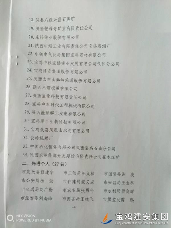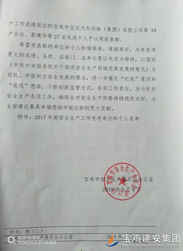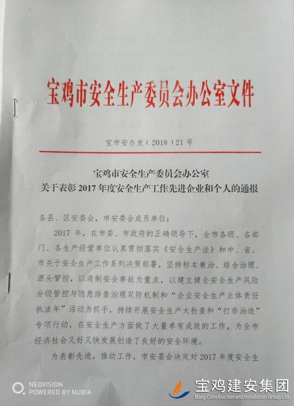 近期,寶雞市安委會(huì)對(duì)2017年度安全生產(chǎn)先進(jìn)單位進(jìn)行了通報(bào),我單位在考核中以?xún)?yōu)異的成績(jī)獲得了此項(xiàng)殊榮。當(dāng)然,取得這樣的成績(jī),離不開(kāi)各級(jí)領(lǐng)導(dǎo)的正確決策和基層單位的艱辛付出,公司安委會(huì)在此表示感謝。 2017年,公司始終圍繞在國(guó)家的大政方針框架下,積極展開(kāi)以《安全生產(chǎn)法》及相關(guān)規(guī)范標(biāo)準(zhǔn)為核心的安全工作,堅(jiān)持標(biāo)本兼治、綜合治理、源頭管控,以遏制安全事故為重點(diǎn),建立健全安全生產(chǎn)風(fēng)險(xiǎn)分級(jí)管控與隱患排查治理雙重機(jī)制,持續(xù)開(kāi)展安全生產(chǎn)專(zhuān)項(xiàng)檢查,杜絕了惡性事故的發(fā)生。在安全生產(chǎn)標(biāo)準(zhǔn)化建設(shè)中,公司始終以“科技創(chuàng)新、合理投入、擇善而從”為出發(fā)點(diǎn)進(jìn)行部署管理,通過(guò)系統(tǒng)管理及一系列舉措,使公司安全管理走在本土行業(yè)前列,且在多次檢查驗(yàn)收中,獲得省、市級(jí)領(lǐng)導(dǎo)的點(diǎn)贊。 九牛一毫莫自夸 驕傲自滿(mǎn)必翻車(chē),成績(jī)只代表過(guò)去,2018年,我們要完善不足,戒驕戒躁,砥礪前行。 寶雞建安集團(tuán)股份有限公司安委會(huì) 2018年4月25日