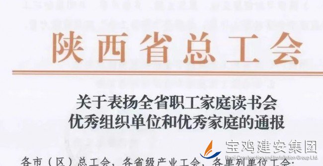 另據(jù)消息,在第28個“世界讀書日”到來之際,由市總工會推薦的全市職工讀書活動兩個代表家庭,被陜西省總工會授予全省優(yōu)秀單位稱號,寶雞建安集團工會成為代表全市職工讀書活動中的典型表率之一,受到全省通報嘉獎,為寶雞贏得了榮譽。