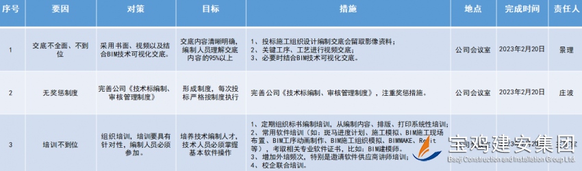 浦賽紅從“5M1E”原因類別入手,即人員、機(jī)器、材料、方法、環(huán)境、測(cè)量,收集各種信息、數(shù)據(jù)資料,對(duì)分析出來的所有末端原因到現(xiàn)場進(jìn)行測(cè)量、試驗(yàn)、調(diào)查分析,找出主要原因,整理分析得出正確結(jié)論,制定滅蚊措施。利用科學(xué)的統(tǒng)計(jì)方法,浦賽紅把這最微不足道的小事,做到了極致,成了“專家”。由此看來,人類從最開始面對(duì)事物到逐步認(rèn)識(shí)世界和改造世界的過程中,統(tǒng)計(jì)方法起到了重大作用。 在科學(xué)技術(shù)高速發(fā)展的今天,統(tǒng)計(jì)方法在潛移默化中得到了日益廣泛和深入的應(yīng)用。技術(shù)管理過程中應(yīng)用科學(xué)的統(tǒng)計(jì)方法排列圖法,提高投標(biāo)施工組織設(shè)計(jì)審核合格率。見下圖:通過整理近年全公司投標(biāo)施工組織設(shè)計(jì)編寫情況,對(duì)投標(biāo)施工組織設(shè)計(jì)審核結(jié)論進(jìn)行分析、統(tǒng)計(jì)、總結(jié)。根據(jù)排列圖分析,影響標(biāo)書審核得分的關(guān)鍵因素是“投標(biāo)施工組織設(shè)計(jì)內(nèi)容針對(duì)性不強(qiáng)”,“項(xiàng)目部、分公司投標(biāo)負(fù)責(zé)人或組織人員缺乏系統(tǒng)性部署”其累計(jì)頻率已達(dá)到77.77%,是主要解決的問題。經(jīng)過討論、分析,按照PDCA原則,最后制定了相應(yīng)實(shí)施對(duì)策與措施,落實(shí)責(zé)任人和完成時(shí)間,對(duì)策表見下圖:學(xué)習(xí)永無止境,在技術(shù)管理方面要不斷掌握和應(yīng)用更多的統(tǒng)計(jì)方法,這樣就有利于更好地解決技術(shù)問題。除此之外,端正工作態(tài)度,提高自身業(yè)務(wù)水平。立足平凡崗位,從點(diǎn)點(diǎn)滴滴日常工作小事做起,腳踏實(shí)地,改變思維,創(chuàng)新工作。從而做到知己知彼,百戰(zhàn)不殆。